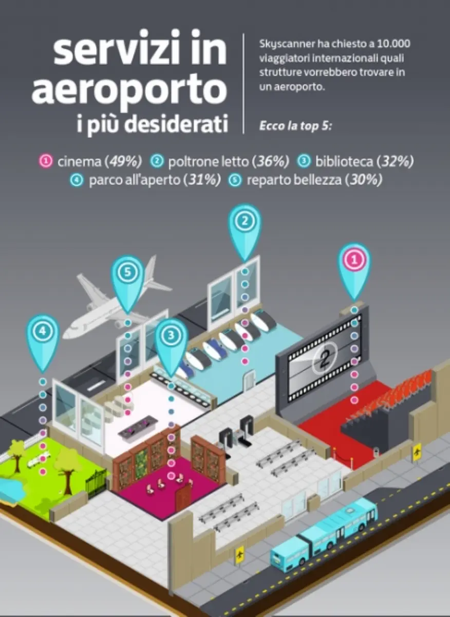 I risultati del sondaggio internazionale condotto su 10.000 viaggiatori da Skyscanner, riferimento nella comparazione dei prezzi dei voli, parla chiaro: il 49% vorrebbe uno schermo del cinema all’aeroporto. Anche la voglia di schiacciare un pisolino è molto forte con oltre un terzo degli intervistati (36%) che vorrebbe delle potrone-letto in aeroporto, cosa che già si può sfruttare all'aeroporto di A...