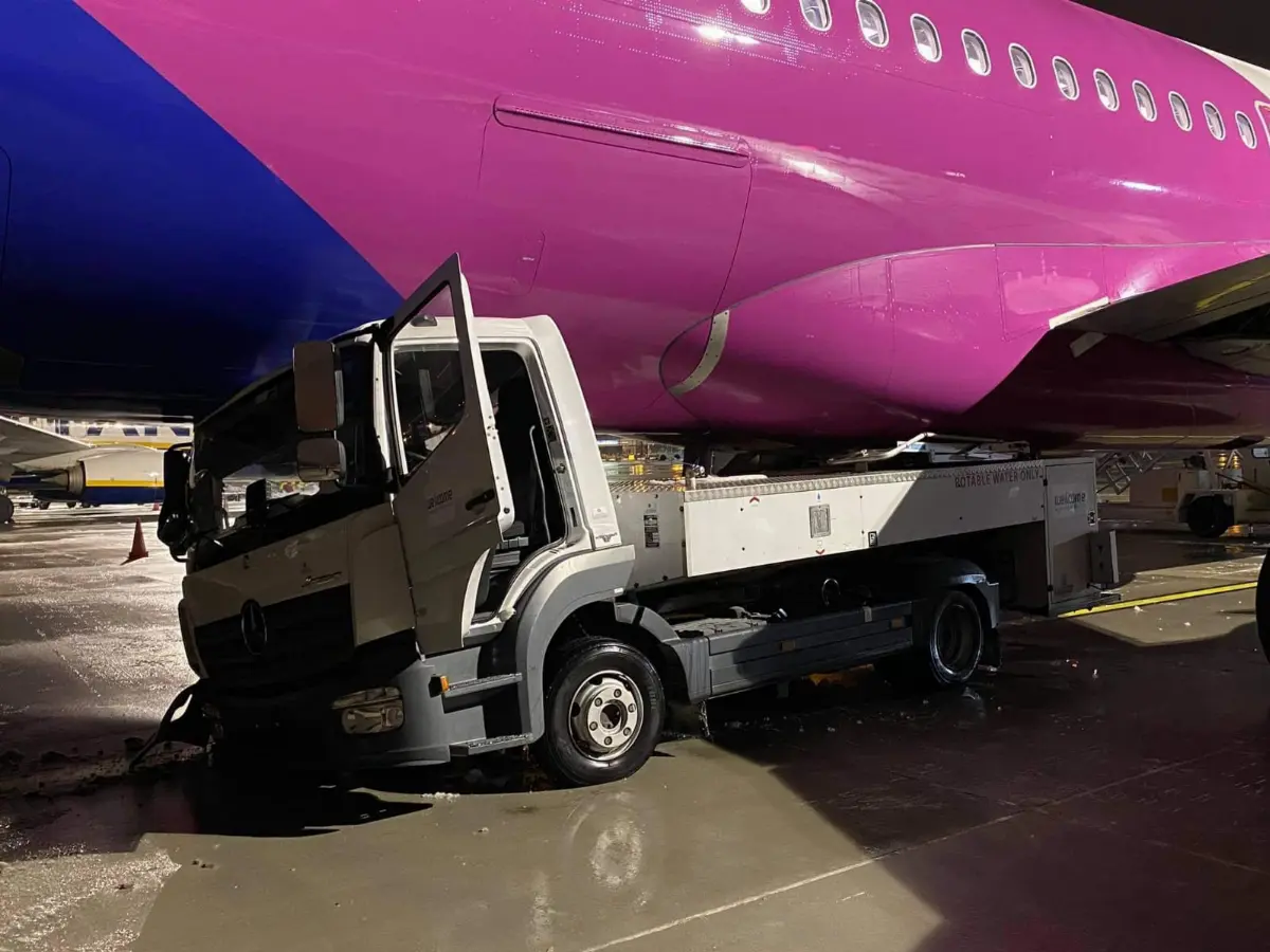 Camion rimane incastrato sotto aereo Wizz Air a Danzica