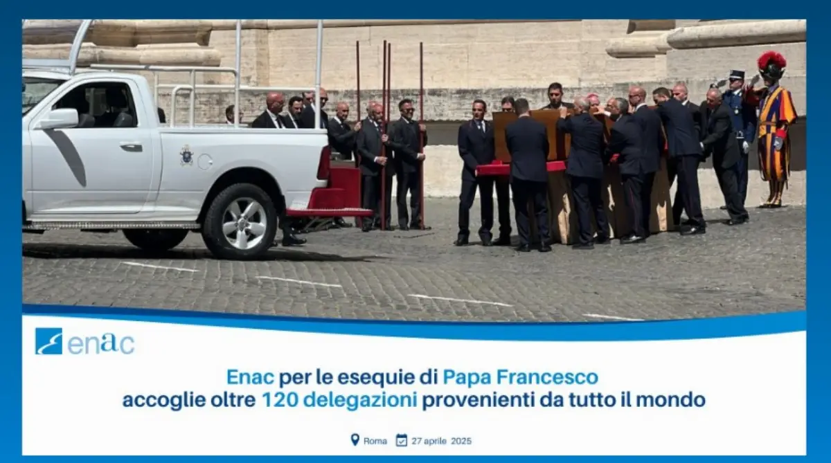 Il presidente Enac Pierluigi Di Palma: "Al termine delle esequie, possiamo affermare che al mondo non ci sia nessun’altra città come Roma per la capacità di accoglienza istituzionale, come abbiamo dimostrato in questi giorni. Desidero ringraziare il presidente del Consiglio Giorgia Meloni per il plauso rivolto ad Enac ed Enav che hanno garantito l’arrivo e la ripartenza delle 170 delegazioni accorse alle esequie di Papa Francesco in assoluta sicurezza e senza interferire con il normale traffico degli aeroporti civili della capitale, garantendo il volo di oltre 300.000 mila passeggeri in arrivo e partenza da Roma in questi due giorni. Il mio grazie va a tutto il sistema del trasporto aereo nazionale, che con riconosciuta professionalità e competenza ha saputo gestire un evento assolutamente complesso come i funerali del Santo Padre a cui va un sentito ringraziamento per l’udienza che ci ha voluto concedere nel maggio 2022 e che ancora illumina il nostro cammino”.