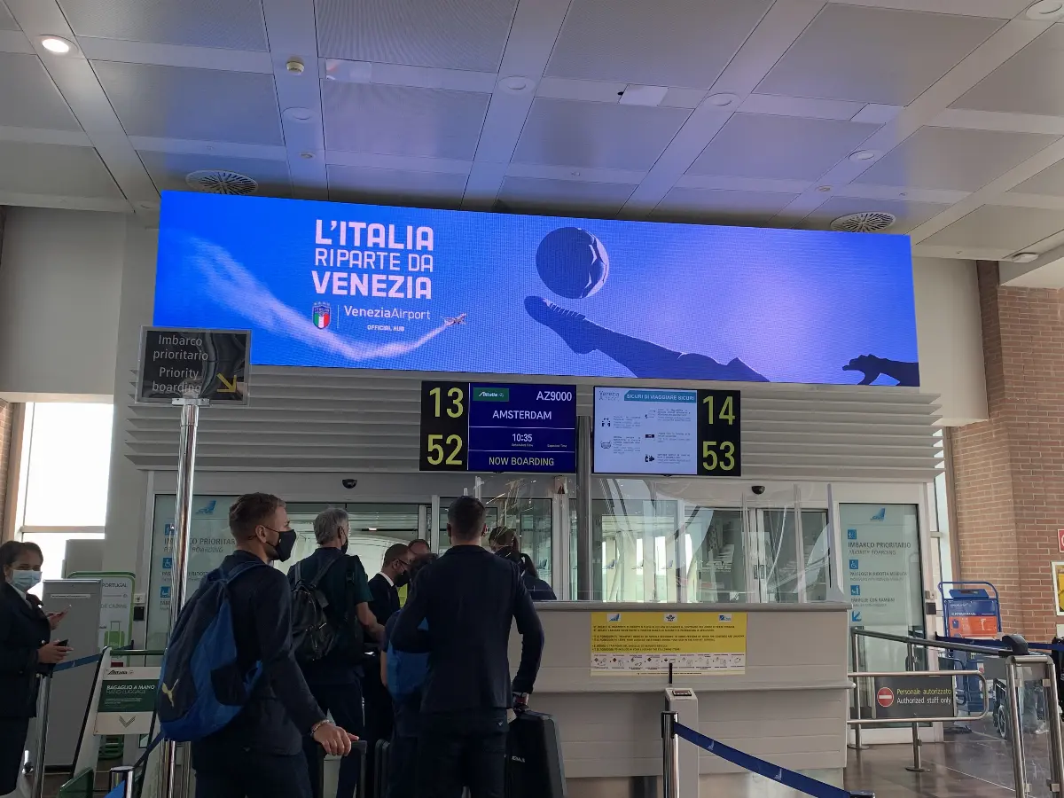 Foto. La Nazionale A maschile di calcio in partenza ieri mattina da Venezia dall'aeroporto "Marco Polo" -official hub delle Nazionali di calcio- per Amsterdam, dove stasera affronterà i Paesi Bassi nella gara ufficiale che inaugura l'inizio della nuova stagione sportiva.Sull'argomento vedi anche la notizia pubblicata da AVIONEWS.