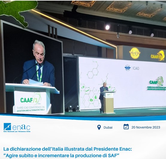Enac: il presidente Pierluigi Di Palma durante la sua dichiarazione nel corso della terza conferenza Caaf Icao sui carburanti alternativi svoltasi il 20 novembre 2023 a Dubai