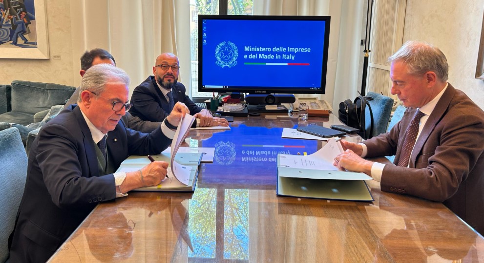 Roma, 7 aprile 2025. Cybersecurity, Adolfo Urso (ministro Imprese e Made in Italy, Mimit, a destra) firma protocollo d’intesa con il direttore generale dell’Agenzia per la cybersicurezza nazionale (Acn), Bruno Frattasi (a sinistra)