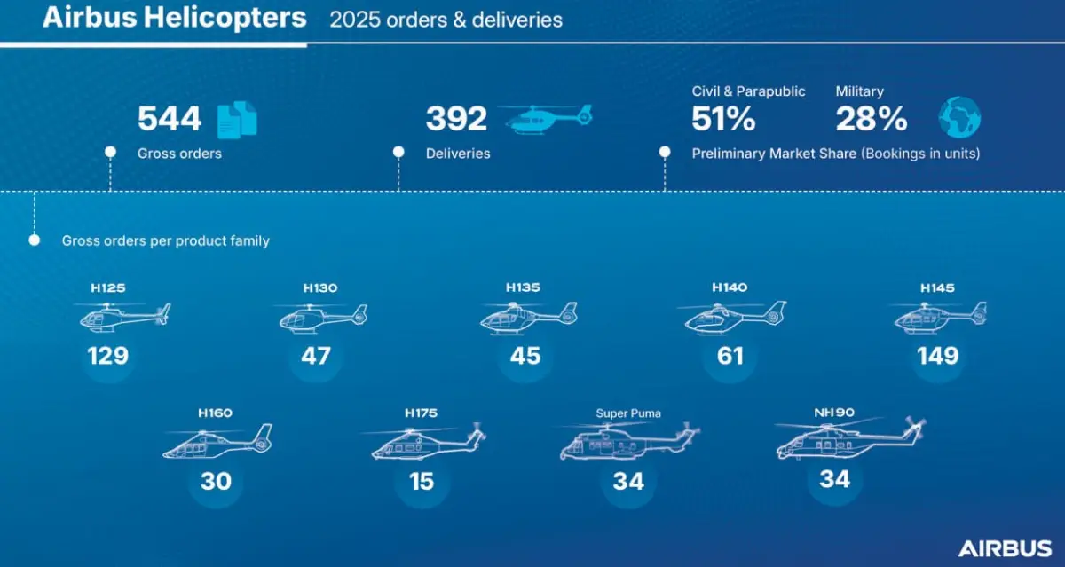Airbus Helicopters ha registrato 544 ordini lordi (536 netti) nel 2025, evidenziando una solida crescita del mercato e prestazioni consistenti durante l’anno su tutta la gamma civile e militare. Le commesse provengono da 205 clienti in 50 Paesi. L’azienda ha inoltre beneficiato di un’importante dinamica di mercato per i suoi sistemi aerei senza equipaggio (Uncrewed Aerial Systems – Uas) nel corso del 2025. In termini di volumi, Airbus Helicopters ha raggiunto una quota del 51% nel mercato civile e parapubblico e del 28% nel segmento militare. Sono stati consegnati 392 elicotteri lo scorso anno.