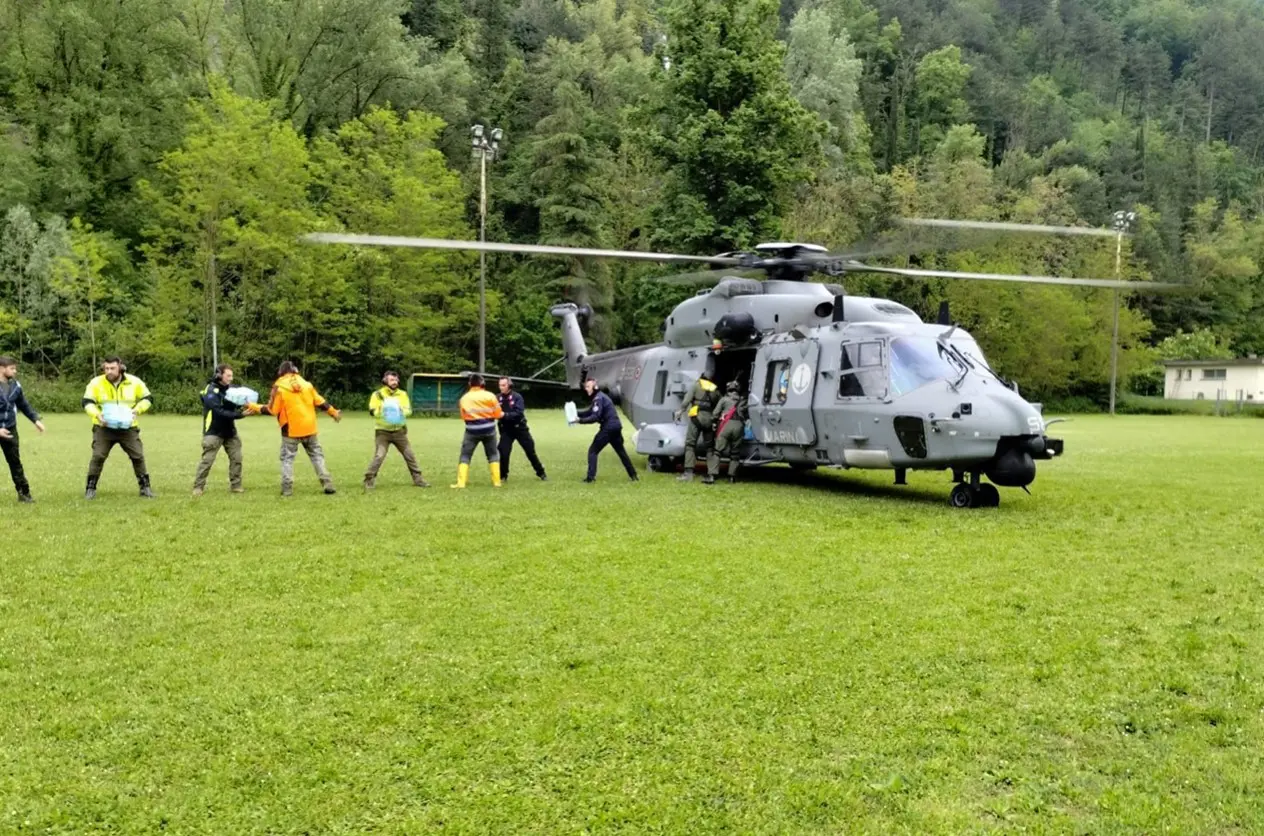 Elicottero della Marina: catena umana per passaggio di beni destinati alle persone sfollate a seguito dell'emergenza in Emilia Romagna avvenuta a maggio 2023