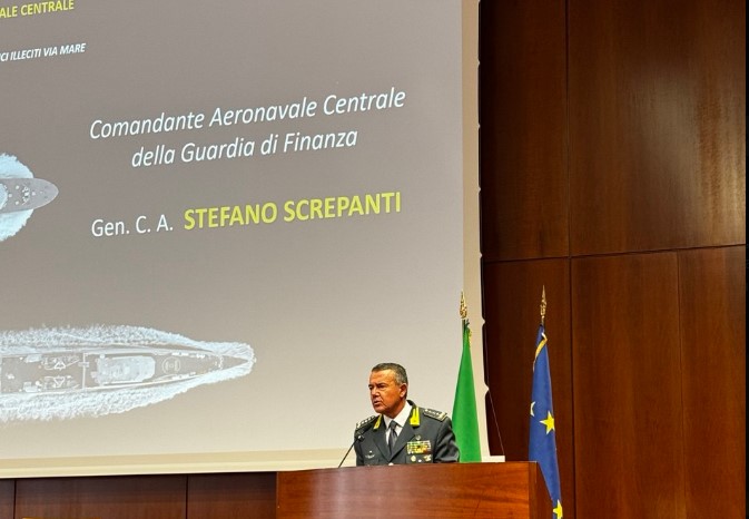Roma, 2 ottobre 2025. Il comandante Aeronavale centrale, generale CA Stefano Screpanti durante il suo intervento al convegno in occasione dei 20 anni dall'istituzione del Comando aeronavale centrale della GdF