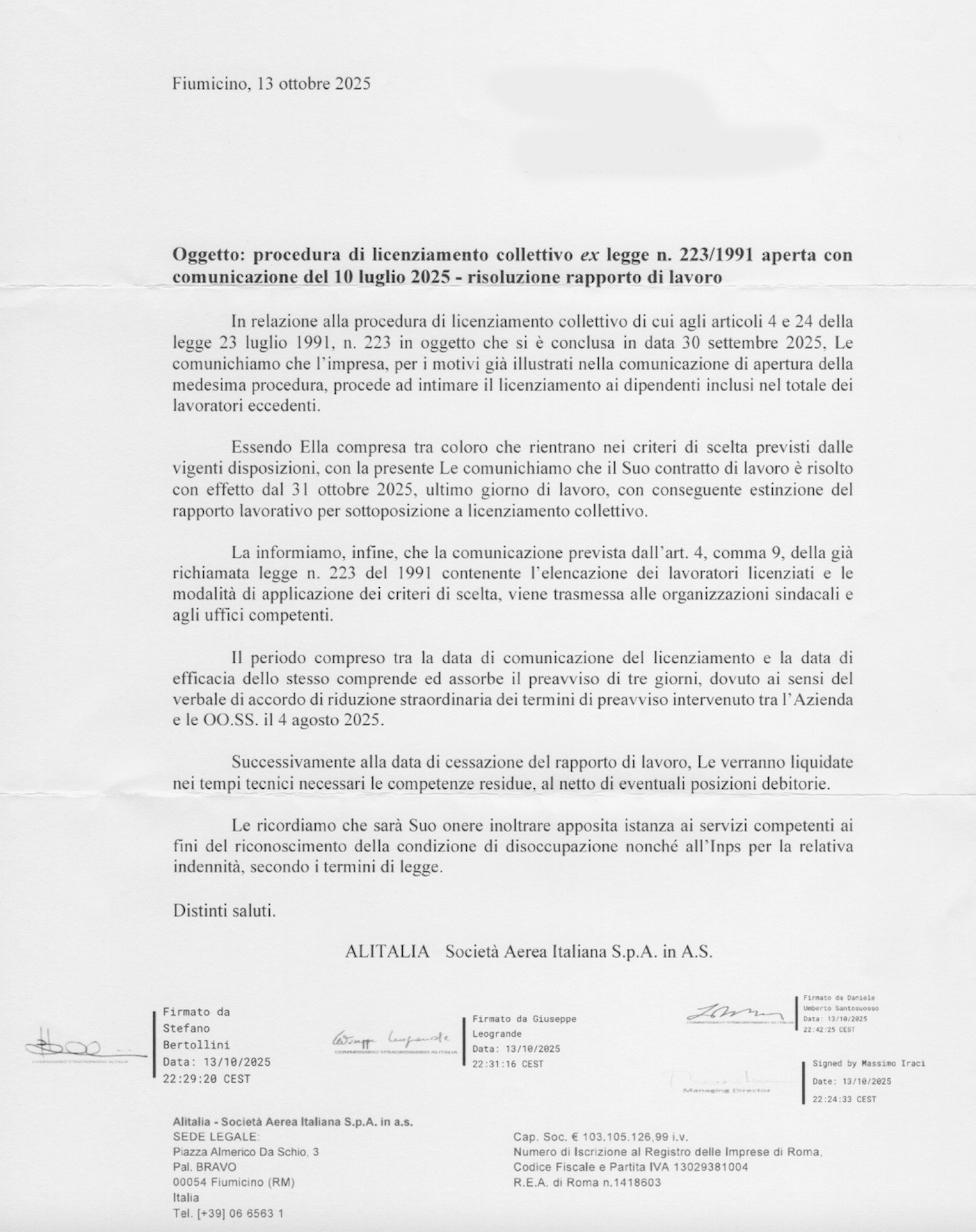 Alitalia-Sai: dismissal letter to personnel on Cigs dated 13 October 2025