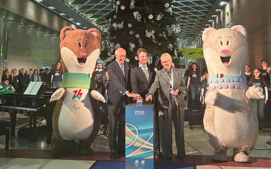 Venezia, 4 dicembre 2025. Enrico Marchi, presidente del Gruppo Save, Alberto Stefani, neo-eletto presidente della Regione Veneto e Monica Scarpa, ad Gruppo Save all'accensione dell'albero di Natale ispirato ai Giochi olimpici di Milano-Cortina 2026 insieme alle due mascotte Tina e Milo