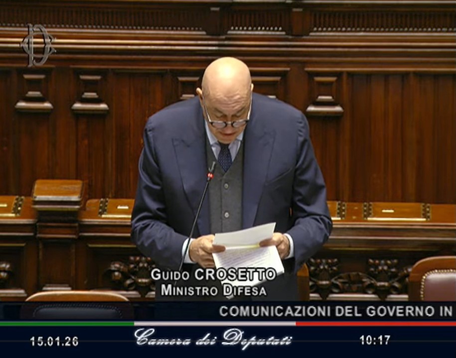 Roma, 15 gennaio 2026. Il ministro della Difesa, Guido Crosetto è intervenuto alla Camera dei deputati per comunicazioni in materia di proroga dell’autorizzazione alla cessione di mezzi, materiali ed equipaggiamenti in favore delle autorità governative dell’Ucraina