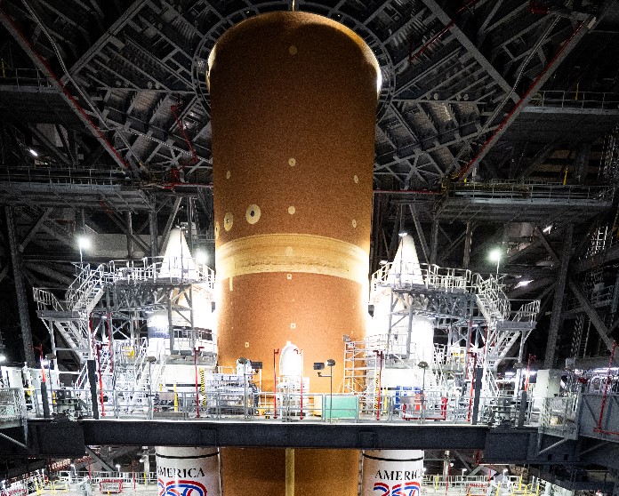 Razzo Sls (Space Launch System) Nasa visibile all'interno dell'High Bay 3 del Vehicle Assembly Building mentre i team attendono arrivo membri d'equipaggio di Artemis II per salire a bordo della navicella spaziale Orion in cima al razzo come parte del test dimostrativo del conto alla rovescia di Artemis II, sabato 20 dicembre 2025, presso il Kennedy Space Center della Nasa in Florida