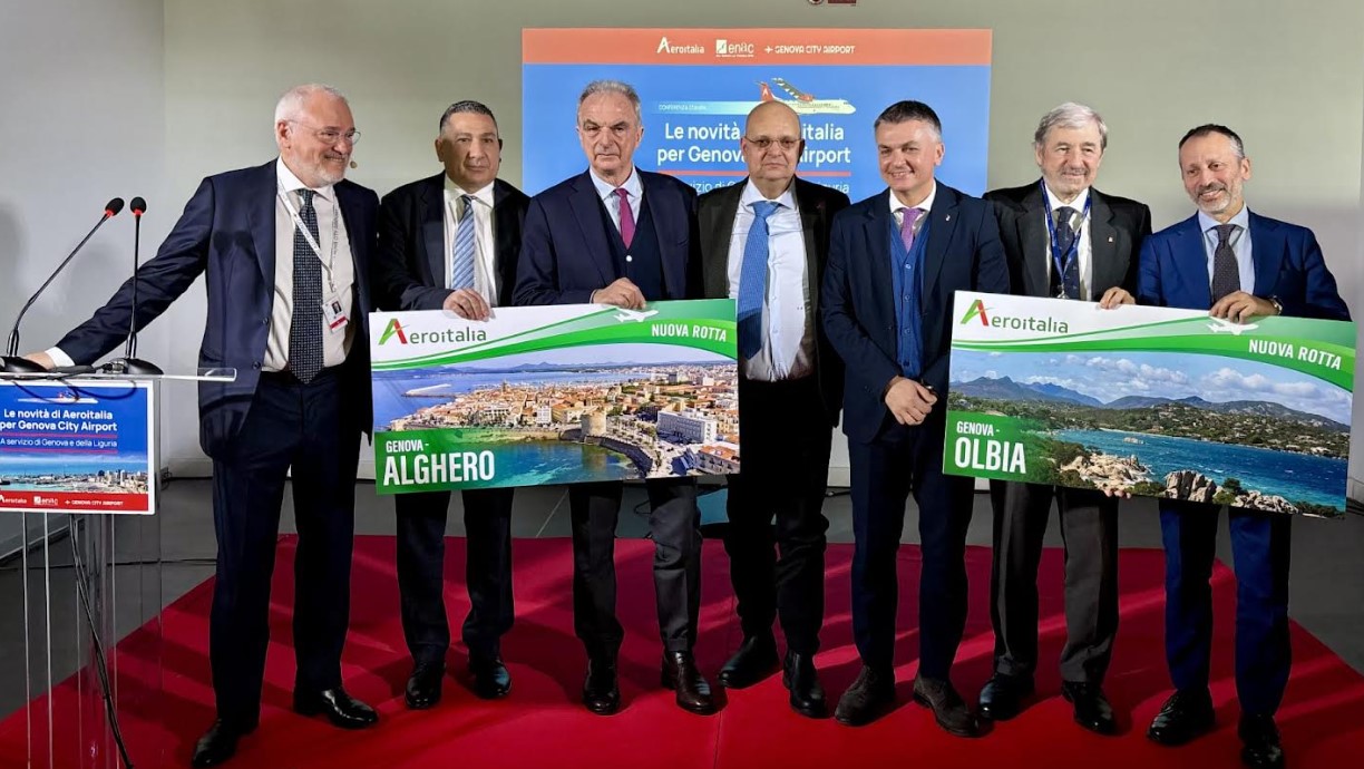 Genova, 9 febbraio 2026. Aeroitalia apre la nuova base operativa a Genova. Da sinistra: Enrico Musso presidente Aeroport, Massimo Di Perna Chief Commercial Officer Aeroitalia, Pierluigi Di Palma presidente Enac, Gaetano Intrieri, ad Aeroitalia, Edoardo Rixi viceministro Mit, Marco Bucci presidente Regione Liguria, Matteo Paroli presidente Adsp Mar Ligure occidentale