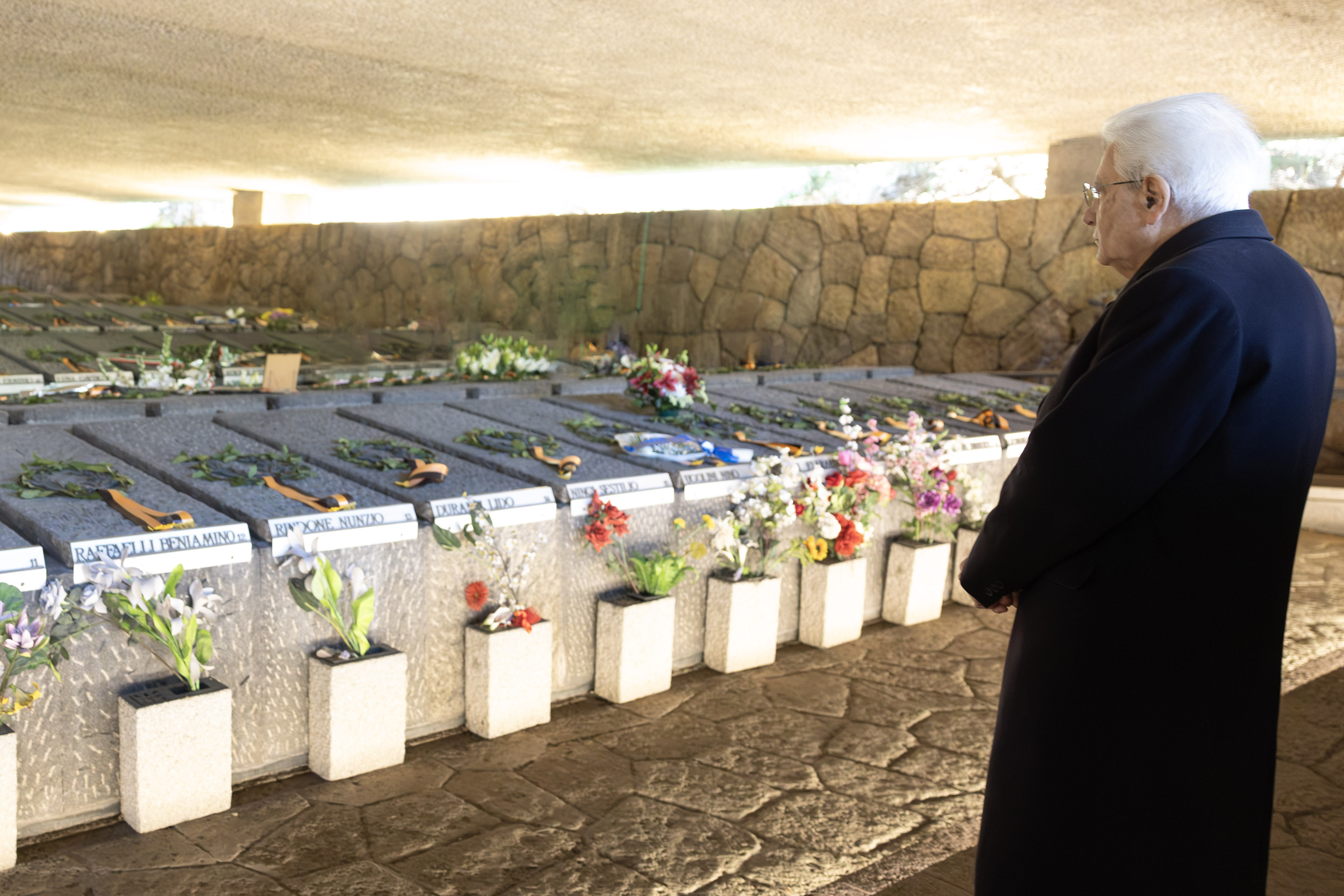 Roma, 24 marzo 2026. Il presidente della Repubblica, Sergio Mattarella, alla cerimonia commemorativa dell’82esimo anniversario dell’eccidio delle Fosse Ardeatine rende omaggio ai 335 martiri trucidati