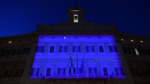 La facciata del Palazzo Montecitorio illuminata di blue nella Giornata mondiale della consapevolezza sull'autismo che ricorre ogni anno il 2 aprile