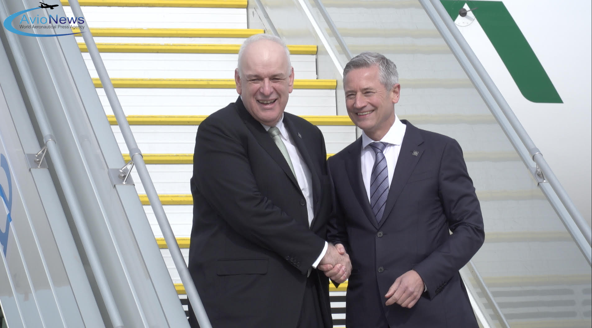 Roma, 31 marzo 2026. Da sinistra: ad di Star Alliance Theo Panagiotoulias e l'ad e dg di ITA Airways, Joerg Eberhart davanti all'A-320 del vettore aereo con la nuova livrea dell'alleanza sulla pista dell'aeroporto romano di Fiumicino